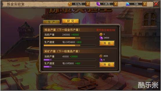 在炼金实验室中可以提升金币和魔晶的自动产量,隔一段时间玩家可以来此收取更多的资源。其中魔晶相关在通关第三章后开启。