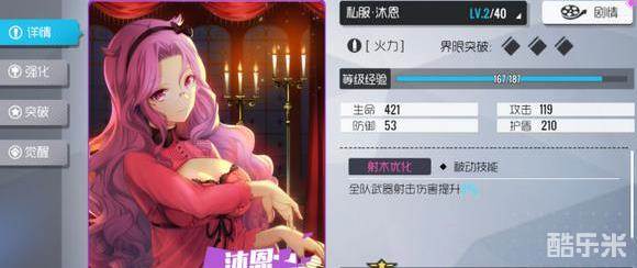 整体而言,私服沐恩拥有SR角色中十分破格的爆发输出能力,但受限于散(霰)弹枪的缺陷,在道中清理杂兵时的效率不尽人意,但在对Boss战时拥有十分优秀的表现,同时其与私服无忧一样十分依赖女仆格兰妮的减CD辅助,因此建议各位视情况进行培养。