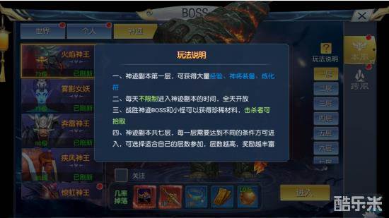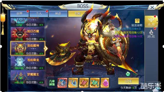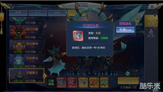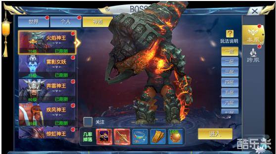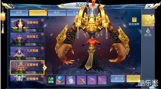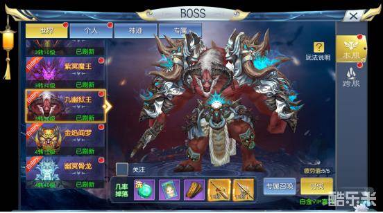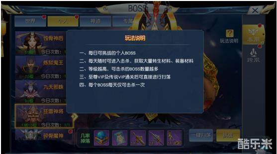 点击主界面boss图标,可以直接进入boss大厅,boss大厅分为世界boss、个人boss、跨服boss、秘境boss和vipboss。