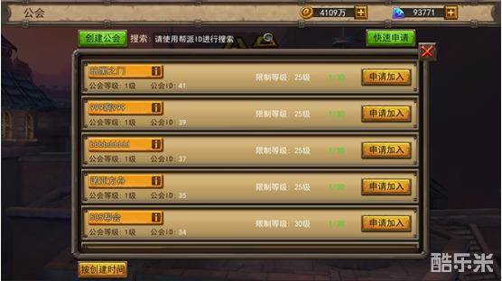 3、点击公会最右侧的“申请加入”按钮,即可向该公会发出加入申请;若选择“快速申请”,则会自动选择一个满足限制条件的公会提出申请。等待公会会长或官员审批通过后,即可加入公会。