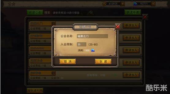 2、点击“创建公会”按钮,输入公会名称,设定入会限制等级(公会创建后还可在公会管理中修改该等级)后,选择创建,消耗一定钻石,就可以拥有属于自己的公会啦。如下图所示: