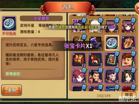 在活动和副本通关奖励中,都有几率会获得武将的卡片包。同时在商城中,也定期会有卡片包进行出售,在背包中可以找到已获得的卡片包的身影。