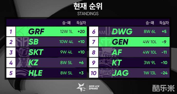GEN在经收获了今天比赛的胜利之后,排名一下子跃升到第七名,虽然进季后赛还是太难,但是至少远离了升降级赛一步。