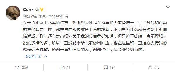 关于近来网上不实的传言,想来想去还是在这里和大家澄清一下,当时我和在场的其他队友一样,都在看向那边准备上台的粉丝,不明白为什么就会被网上新闻描述成这样,还有之前很多关于我的传言我都知道,但是迫于成绩一直不理想,说的多错的多,所以一直没能来给大家做出回应,也在这里和一直担心支持我的粉丝说声抱歉。感谢一直相信我的人,谢谢你们,我会继续努力的。