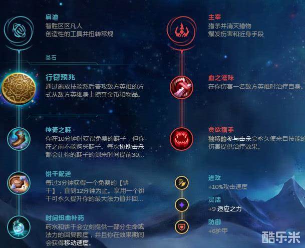 副系点出启迪系的神奇之鞋、饼干配送和时间扭曲补药,副系点出主宰系的血之滋味和贪欲猎手。小符文则选择攻速、适应之力和护甲。副系点出的神奇之鞋可以省下300的经济,加快自己的出装速度。饼干配送、时间扭曲补药和主宰系的两个天赋都是为了增加自己的线上恢复能力,可以更好地跟对手换血。