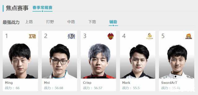 辅助位置上,RNG辅助Ming以66的超高战力值拿下第一宝座,他比第二名的Mni选手高出了10点的战力值,可以说是非常恐怖了。其实在LPL官方公布选手战力榜之后,Ming就持续拿下辅助榜第一宝座,可以说是当之无愧的LPL最强辅助。