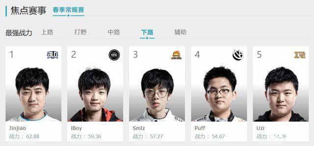 在ADC位置上,BLG战队Jinjiao拿下了第一宝座,和ADD一样,不少玩家质疑Jinjiao排名第一。第二名由EDG的iBoy拿下,他的战力值来到了59.36,第三则是战力值为57.27的Smlz。令人意外的是,Uzi战力值仅54.36,排名AD位第五,JKL更为凄惨,直接就没有上榜……