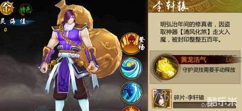 李轩辕是一个橙色品质的守护灵,在技能方面上,其比较突出的两个技能就是无量清风和醉仙望月了。