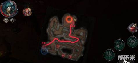 进入二层之后,也是从图①开始,然后往上走之后走到中间往右拐,经过一个路口往下走,一直走到最下面往左边走一点点到达图②,那边有一个宝箱吞噬者,打败他获得奖励,沿着左边路线往上走之后顺着路往左拐,一直到头走到图③,会有一个大宝箱,开启之后不要立刻走掉,继续沿着路线往下走到图④,走到头之后还会有一个宝箱!开启之后按照原路返回,走到上面的时候直接沿着路线一直往上走,到达图⑤的位置就可以看见我们的大BOSS沃尔泰克,这个BOSS攻击你的时候会有特殊效果,眩晕和防御下降都是对我们很不利的效果,不过这个BOSS自身的攻击力并不强,所以大家看见自己的被加上效果之后不要太害怕,慢慢和BOSS周旋就可以轻松过关了!