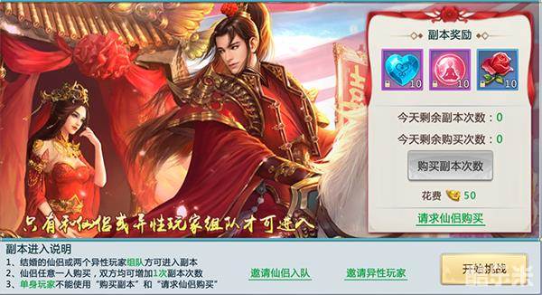 上仙们达到213级后开启情缘副本,通过主界面 仙缘——副本——开始挑战进入。只能由两位异性或一对仙侣组队才可进入情缘副本。