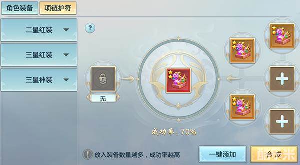 上仙们可以通过消耗本职业多余的同阶二星橙装来合成同阶的二星红装,而三星红装则需要使用二星红装来合成。最低可以用三个装备进行合成,成功率为70%,五个装备作为材料时必定成功。