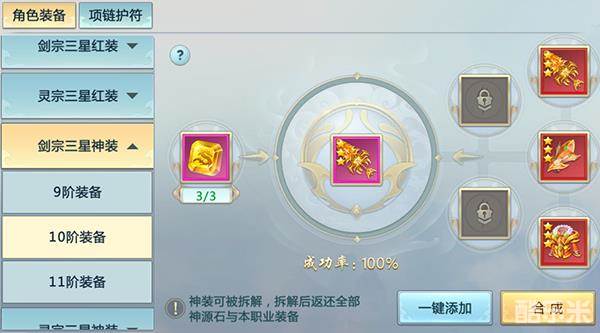 装备合成功能会在上仙们达到270级时开启,分为角色装备与项链护符两部分,合成规则有少许不同。装备合成时必须以五阶二星橙色以上的装备为材料。等级达到巅峰10级后,还将陆续开放9~11阶的神装合成,祝您打造最强终极粉装!