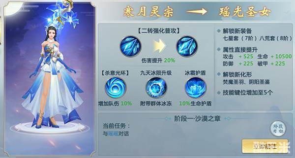寒月灵宗达到220级后,便会开启二转任务。二转任务总共有3个阶段,根据任务提示完成3阶段的任务后,就可以成功转职了。