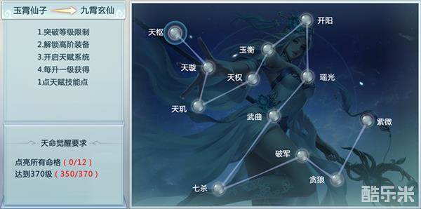 玉霄仙子达到350级后,便会开启四转任务。点亮所有12个命格,并达到370级后即可成功转职。消耗经验值或者天命魂石可以点亮命格,获得大量属性加成。完成四转需要大量时间获取经验值以及收集天命魂石,转职周期较长,上仙们可以在商城购买天命魂石,缩短完成四转的时间。