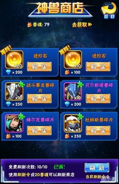 在商店内可以用兽魂和钻石兑换到进阶石,数码兽碎片、数码蛋等稀有道具。兽魂可以通过分解数码兽或者是挑战历练副本获得。