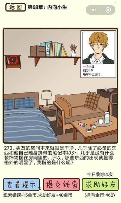 在再见吧渣男手游中内向小生第270关究竟该怎么过呢?在再见吧渣男手游中这一关我们发现男友房间里出现了一样非常显眼的物品,那究竟是什么呢?下面就来看一下吧!