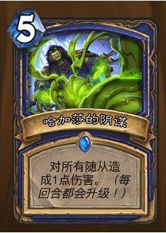 萨满5费法术,对所有随从造成1伤。每回合升级。对应新机制,阴谋牌:在手中时每回合效果+1,也就是说每个新的回合开始,伤害+1,会越变越强,但是5费打所有随从,得打几才不亏,个人以为起码4吧!因此意味着这张卡得在手中卡上一段时间,作为前期AOE肯定是不指望了,但是越拖到后期效果越可怕,7、8、9伤都不在话下。(而且没有过载)但强归强,还是没有解决萨满前期的场面问题。