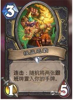 总共有5种1/1,效果分别为战吼打2、使一个友方随从变成+1费随从、使一个友方随从获得突袭与+1攻、战吼发现一张法术、随机召唤一个2费随从,不得不说,跟班卡是盗贼的最爱,(专业通下水道)触发连击的小弟;回到怪盗恶霸这张卡,3费1/5是小亏的身材,但是对后续有极大帮助,新版本肯定有得发挥。