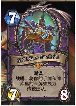 术士7费橙卡,7费7/8嘲讽,战吼,将手牌和牌库所有牌变成传说随从,这个应该对应新机制:回望牌,回望探险者协会的boss拉法姆以及黄金猿,这张卡笔者同样以为很强,首先7费7/8嘲讽对场面有及时的帮助,很不错的抗压能力。其次全部变成传说以后,战斗力基本不会太差(运气太差另说)。而且面对哈卡的“堕落之血”表示毫无压力。更可怕的是,或许可以用在动物园中,让动物园前期凶一波,万一怼不死对手,把那些弱B随从全部变成传说,瞬间雄起。(术士的橙卡,因为技能的抽牌,上手率总是比其他职业要高)