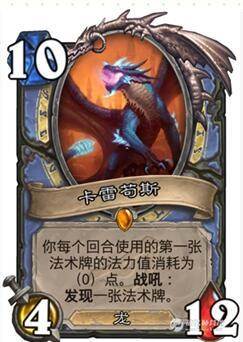 法师10费橙卡,10费4/12龙,战吼发现一张法术,光环:每回合第一张法术消耗为0,毫无疑问这张卡很强,场面上不仅有持续的法术减费威胁,而且最差的情况:入场打出发现的那张法术!!!可以是一发0费aoe解场!或者一发炎爆术。不过缺陷就是10费以及作为橙卡的上手率问题,面对快攻依然毫无办法!