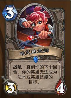 中立3费随从,3/4标准身材,战吼:直到下回合,你的英雄无法成为法术牌和英雄技能的目标,看起来非常美好,因为在冲锋随从只减不增的今天,如果我们有了这张封锁英雄技能伤害和法术伤害的卡,那么在对手没场面的情况下,就可以大概率保证英雄不死了,特别克制法术类的OTK和靠法术补伤害击杀对手的卡组,不过时机还是需要玩家自己把握。一张功能性法术设计成一个战吼随从,真有点蹩脚。(带他更多时候应该是为了防斩杀吧!然而却是3费随从???)但说起来斩杀也不好防,火车王、奥金斧这些是防不胜防。(冲锋随从、武器)