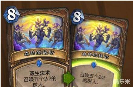 德鲁伊8费法术,召唤5个2/2树人,双生法术:施放后将一张复制放入手牌,复制不具备再生的能力(觉得好熟悉,没错,就是和牧师的增生手臂一样的机制)。这张卡个人以为目前来看价值一般,虽然德鲁伊有树语者可以把树人变成5/5,但是8+5???一回合打不出去,就连配合4费丛林之魂打一个赖场combo也不够,还缺两个激活,看新卡吧,应该是有货的,本次新版本很大概率会延续“砰砰计划”对树人德的推崇。