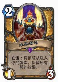 2费的随从,死亡回牌库,并且会保留buff,还可以带2张,理论上只要有剑龙骑术这种加嘲讽的buff的话,对手就要解,那么就会一直回牌库,加上带2张,就可以不断往复,但是这个无限需要对手有足够的解场能力,可以把祭司送回牌库,并且没带沉默,相对苛刻一点的“无限”。