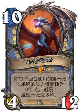 10费4/12的身材,你的每个回合使用的第一张法术牌的法力值消耗为(0)点。战吼:发现一张法术牌。就算我玩法师是最多的我也只能说一句太超模了,卡雷苟斯下场就能马上白用一张法术牌,而且还能战吼获得一张法术牌,要是用了一张炎爆又发现了一张呢,对面直接就可以跪了,估计玩家们对这张卡有很大的意见,在我看来也是早晚要削的。暴雪肯定希望保持平衡性,这张牌就是破坏平衡性的。