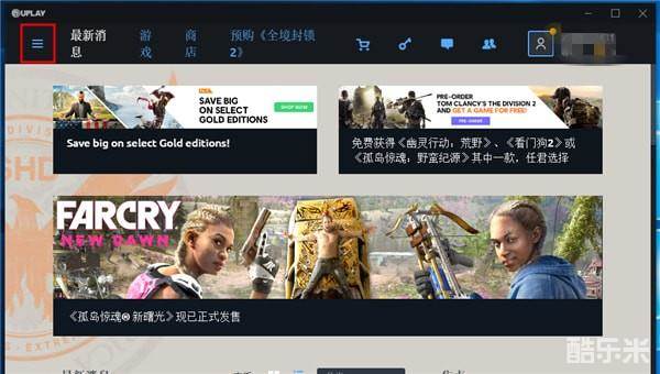 1、下载好游戏之后,在uplay平台的主菜单界面中点击左上角的三条线的按钮: