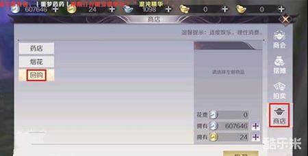 然后在右边选择商店,可以在左边看到药店、烟花、回购,直接选择回购,就可以看到自己出售过的东西了,然后点击回购即可收回不小心出售的东西。