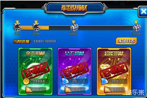 军团捐献分为,金币捐献、钻石捐献与超能捐献3种。花费越高,获得的荣誉点数就越高,玩家可以根据自己的情况量力而行,全军团的捐献额度达到指定数量全军团的成员都能获得丰厚的奖励哦。