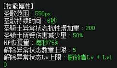 可为550PX范围内的所有队友包括自身每秒恢复75%HP(每级成长5%)并解除异常状态,数量5,解除上限:LV95+10
