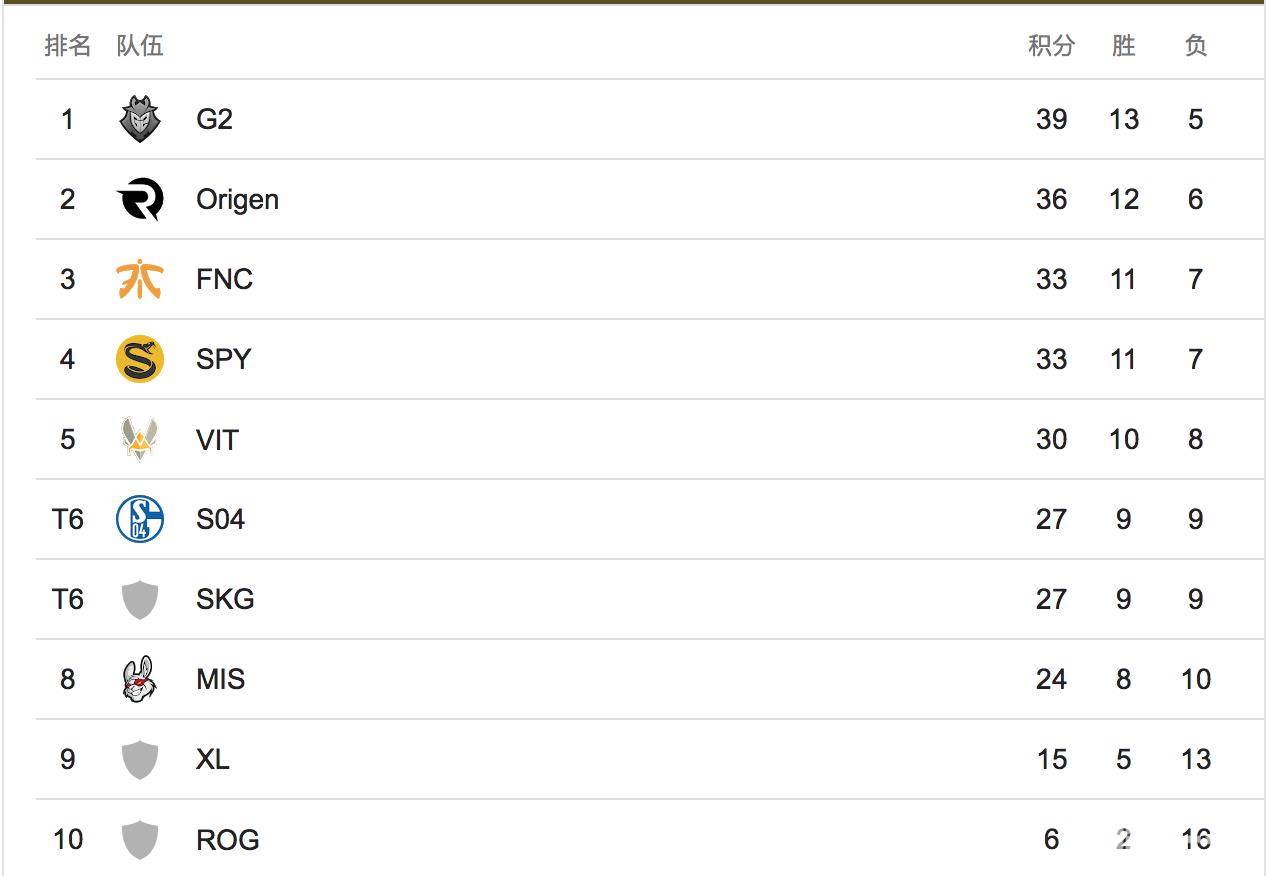 在本周的LEC比赛结束后,常规赛已经告一段落。各战队在本赛季的排名为: