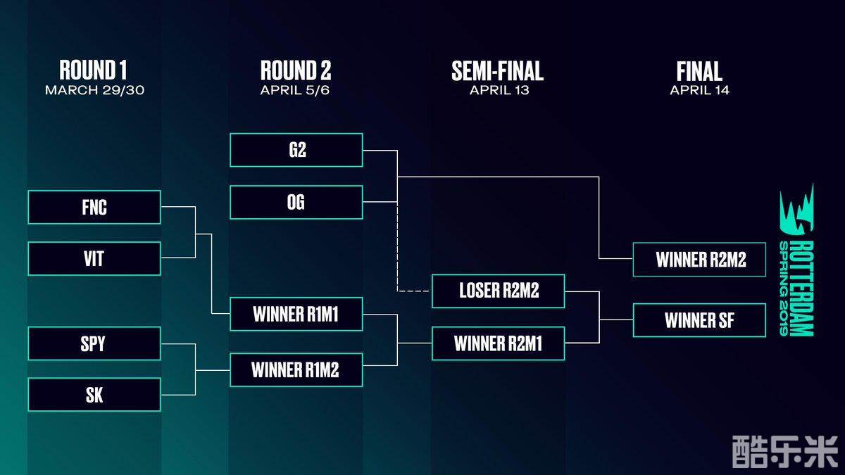 第一轮比赛将于3月29日和30日开始,分别是第三名对阵第五名(FNC vs VIT)和第四名对阵第六名(SPY vs SK)的比赛。第二轮将在4月5日和6进行,首局比赛为排名前二的队伍(G2 vs Origen),胜者直接晋级决赛,第二局则为第一轮比赛的胜者对决,而G2和Origen对决中的败者将在4月13日面对4月6日第二场比赛的胜者。4月14号将进行LEC春季赛的总决赛。