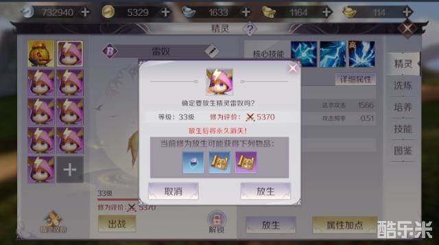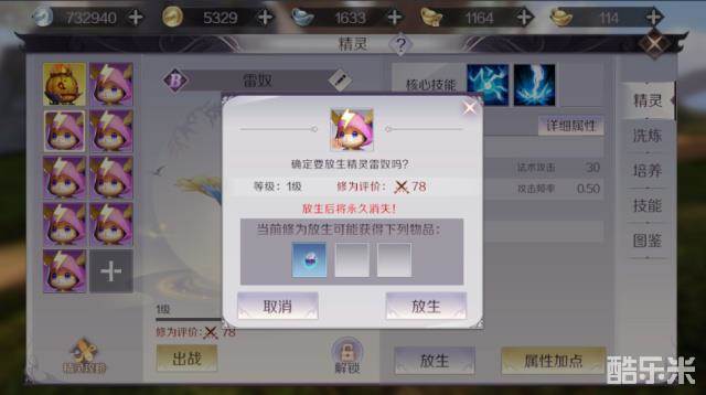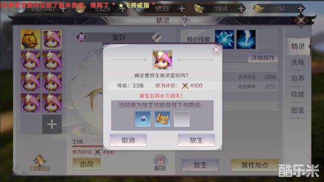 我们只需要给精灵用2个聚源石,就可以让精灵升到30级,然后放生就可以还回2个聚源石,还有几率得到技能,真是美滋滋。经过小编早上的实验,发现精灵修为过5000,才有机会拿到高级技能,5000以下最多是普通技能。
