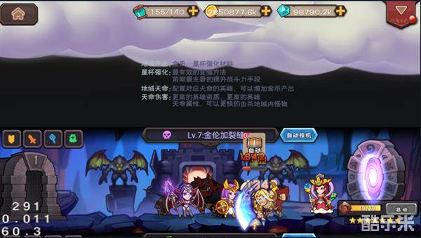 游戏玩法从左至右依次是【排行榜】、【联盟】、【邮箱】、【地下城】、【邮箱】、【试炼台】,【命运之井】、【装备】、【竞技场】、【通天塔】、【星杯】、【商店】和【时空远征】。