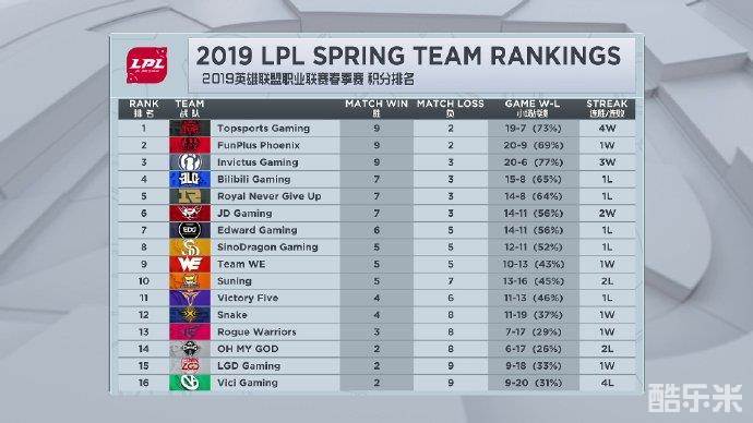 2019LPL春季赛常规赛已经进行到了第八周,在今天的比赛中FPX让一追二击败EDG,IG连胜两局战胜VG。LPL春季赛的积分排名也有所调整:EDG重回第七名,TOP、FPX、IG霸占前三甲