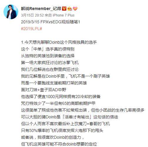 在FPX和EDG的比赛中,Doinb的亮眼发挥成为焦点,在第一局失利之后,连续两把拿出中单加里奥,包揽两局比赛的MVP。而在第一局中,Doinb在用中单飞机对抗EDG中单刀妹的时候,冰拳飞机的出装也引起了不小的争议。解说记得发文称:我很喜欢Doinb的创造力,但飞机这英雄可能不符合doinb想要的定位