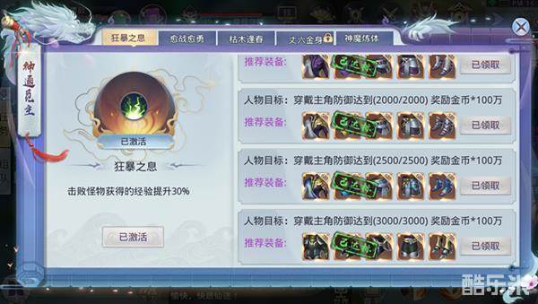 防御达到相对应的要求既可领取百万金币奖励,所有目标完成后即可获得被动技能【狂暴之息:击败怪物获得的经验提升30%】对于想冲等级榜的小仙友们,完成的越快越好哦~
