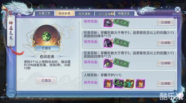 穿戴装备、守护达到相对应的要求既可领取丰厚的战纹精华奖励,所有目标完成后即可获得神级PVE被动技能【愈战愈勇:受到3个以上的怪物攻击时,被动提升20%技能伤害,持续3s】