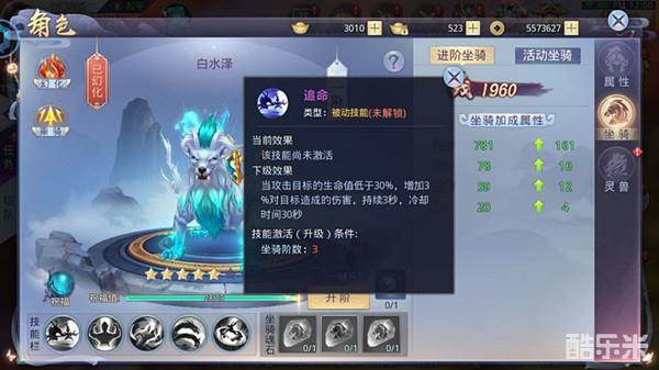进阶坐骑有五个被动技能,在坐骑达到三阶之后即可解锁第一个被动技能“追命”,其他四个被动技能则在坐骑阶数达到五,七,九,十阶自动解锁哟~