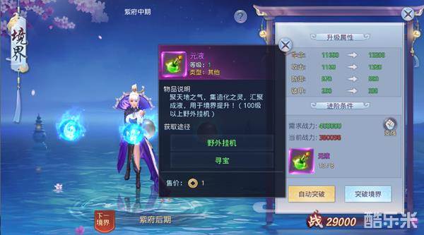 突破境界需要消耗道具-元液,不同境界所需消耗不同,元液通过击杀野怪获得,掉率偏低,除此之外,每个小境界、大境界的提升都有战力的限制、仙友们需达到需求战力方可突破哟,仙友们请注意啦!