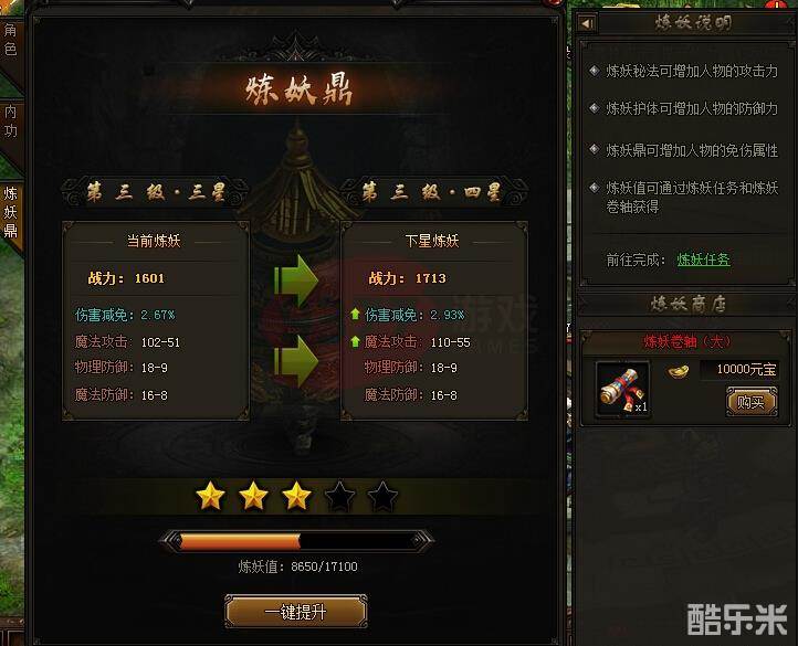 炼妖鼎可以提升玩家角色的各方面属性:炼妖秘法可增加人物的攻击力、炼妖护体可以增加任务的防御力、炼妖鼎还可以增加任务的免伤属性。