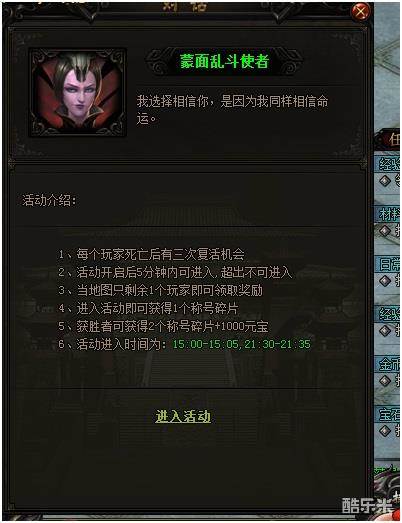 赤月传说2蒙面乱斗活动进入时间为15:00-15:05以及21:30-21:35,等级达到85级的玩家都可参与。而活动进入时间只有短短5分钟,想要参与活动的玩家务必要把握好时间。超出时间,玩家就不可以进入了。