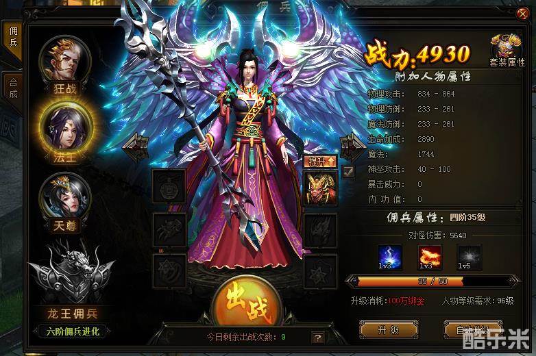 玩家找到要使用的佣兵头像,再点击界面下方的“出战”按钮,就能将选中的佣兵召唤出来。每个角色的佣兵每日出战次数为5次,购买至 尊魔灵可额外增加5次召唤次数。玩家出战次数为0时,可购买次数或等待10分钟后,自动回复1次次数。玩家在切换佣兵出战时,需要消耗出战次数。