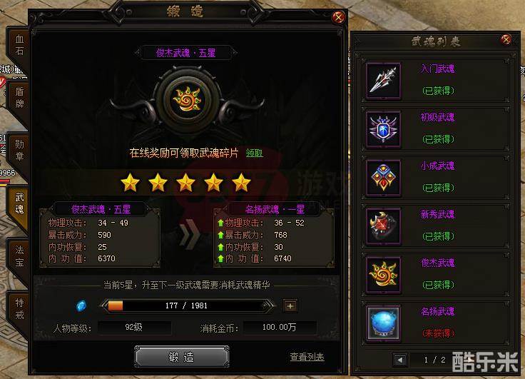 赤月传说2武魂系统是锻造系统里的一个分支玩法,玩家符合一定等级要求,进入到锻造系统就可找到武魂的玩法。大家可消耗一些武魂碎片和金币,来锻造各种级别的武魂,武魂有多个级别,诸如入门武魂、初级武魂、小成武魂等,武魂等级越高,佩戴等级要求越高,而且武魂自身的属性,也会越好随之增高。