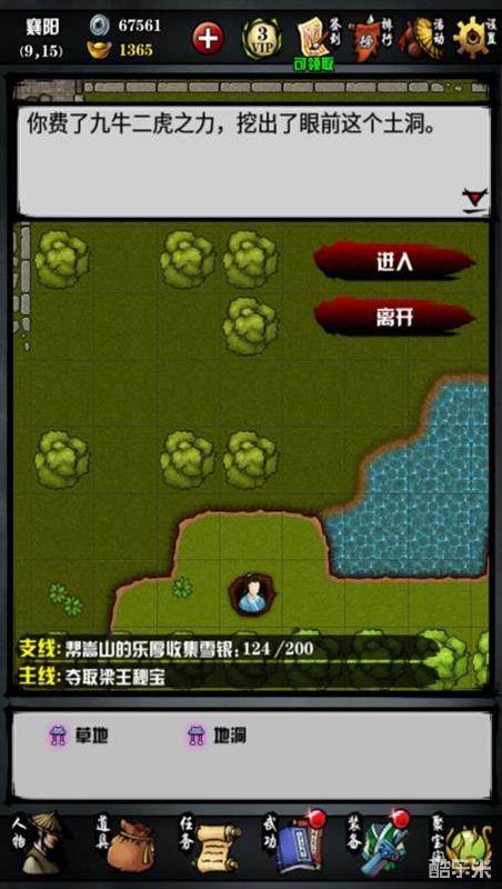 随着触发任务后会给你个提示,让你搜索潭溪湖,,带上几把铁锹在(9,15)座标处开挖就可以了(小编是用高级的铁锹挖的~)