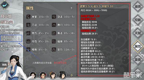 注意:人物面板左侧的攻击力和韧性属性表示对攻击、暴击、防暴击、防御力、生命值属性综合评估的估值。