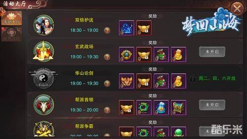 活动大厅中全天活动不停歇,世界首领、双倍护送、武林问答、帮派争霸、温泉及护送等玩法等,多种多样的玩法各有乐趣,让所有侠客都能在江湖中找到属于自己的乐趣!