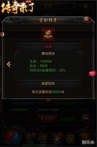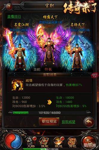 而作为一名响当当的武将,自然可以享受到不同于平民百姓的特殊待遇。在《传奇来了》当中,官职的激活以及进阶,能够让勇士强者们实现生命、攻击以及对BOSS伤害增加这三大属性的提升。此外,官职所拥有的专属“威慑”效果,可以让勇士强者们在攻击威望值低于自身的对手之时,伤害会增加一定百分比!